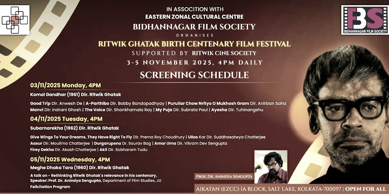 গোপাল দেবনাথ : কলকাতা, ২ নভেম্বর, ২০২৫। বিধাননগর ফিল্ম সোসাইটির উদ্যোগে বিশ্বখ্যাত চলচ্চিত্র পরিচালক ঋত্বিক ঘটক এর জন্ম শতবর্ষ উপলক্ষে পূর্বাঞ্চল সাংস্কৃতিক কেন্দ্রের যৌথ উদ্যোগে বিধাননগরের ঐকাতান প্রেক্ষাগৃহে সোমবার ৩ নভেম্বর অনুষ্ঠিত হতে চলছে ঋত্বিক ঘটক জন্ম শতবর্ষ চলচিত্র উৎসব।